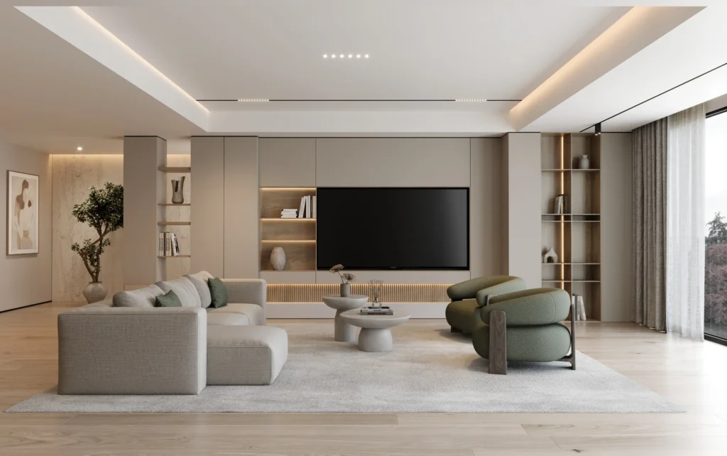 A paleta neutra, os materiais naturais e a iluminação indireta reforçam uma atmosfera acolhedora e contemporânea, ideal para quem procura inspiração para renovar a sala de estar com sofisticação.